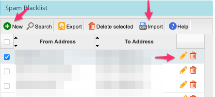 You can modify an existing Blacklistt entry selecting the entry and clicking on the pencil on the right (see figure below) :