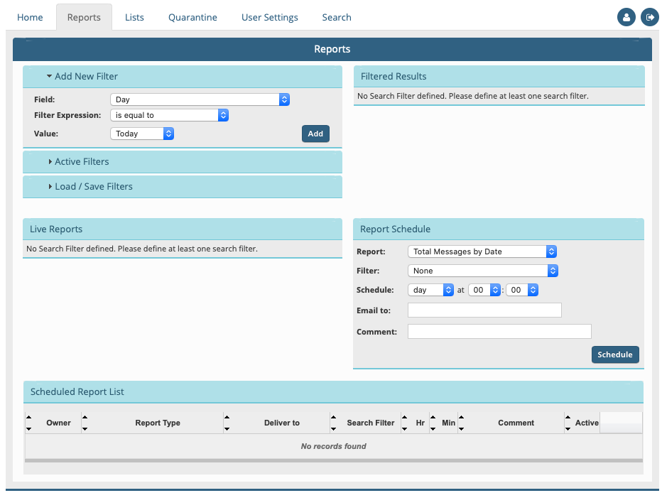 Libraesva ESG offers full reporting capabilities. Accessing the menù Report will open the following screen: